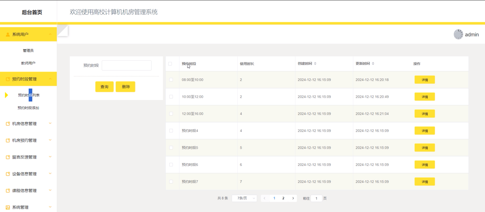 预约时段管理:通过预约时段管理,管理员可以添加新的预约时段,查询现有时段,查看时段详情,以及删除不再需要的时段。这确保了机房预约的时段设置灵活且符合实际需求。