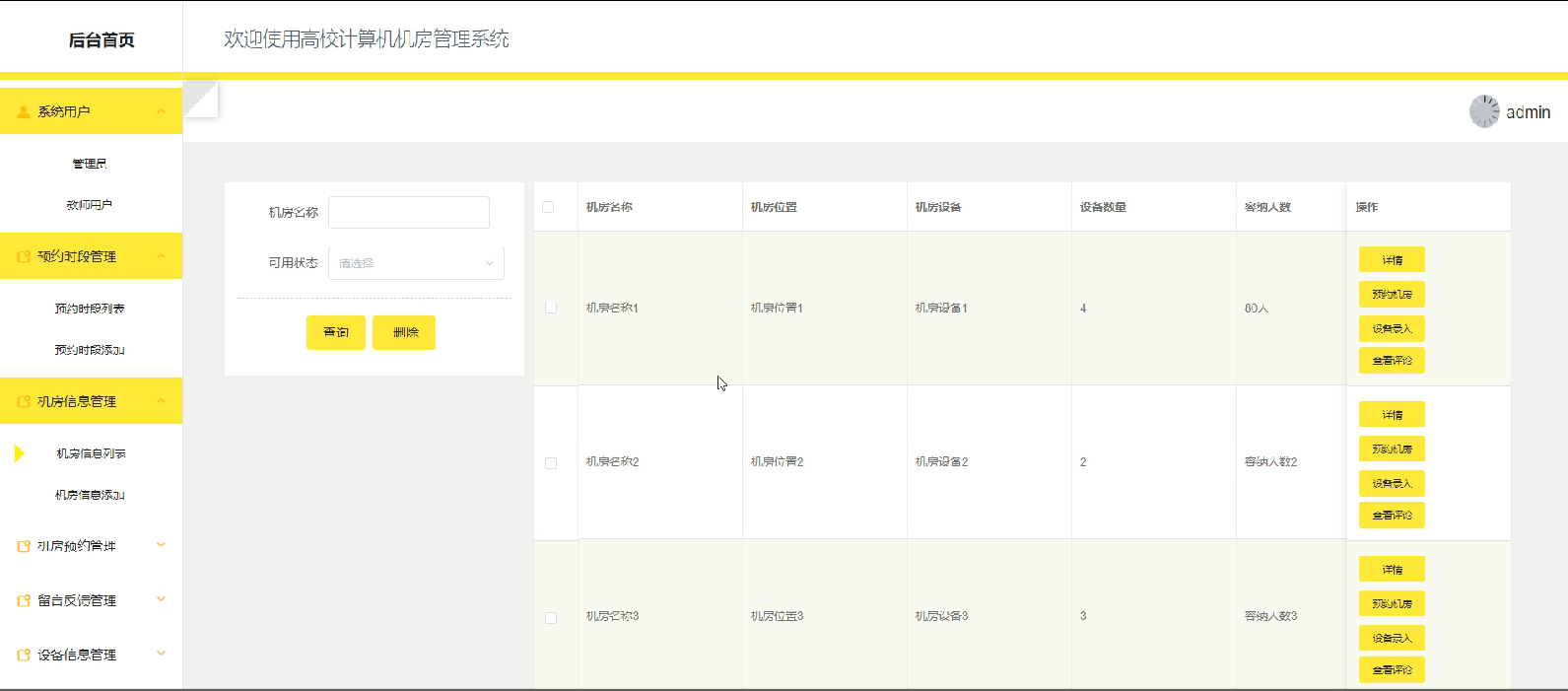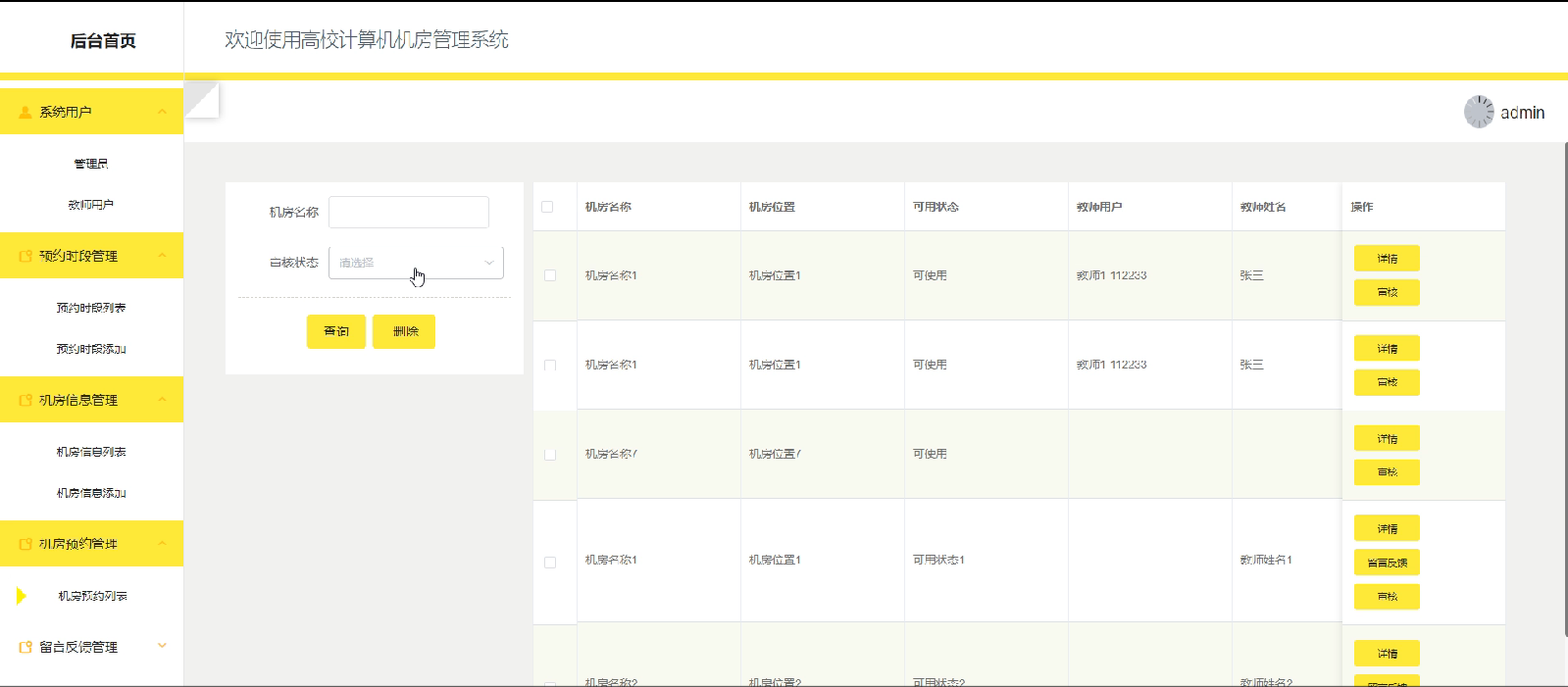 机房预约管理:管理员可以查看所有用户的预约信息,并进行审核回复或删除操作。这确保了预约流程的透明性和合理性,同时管理员可以及时处理不当预约或空闲资源的再分配。