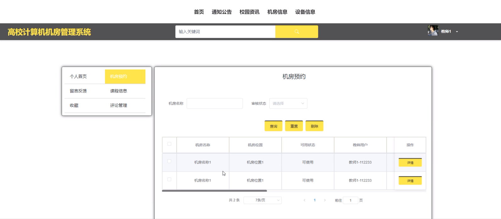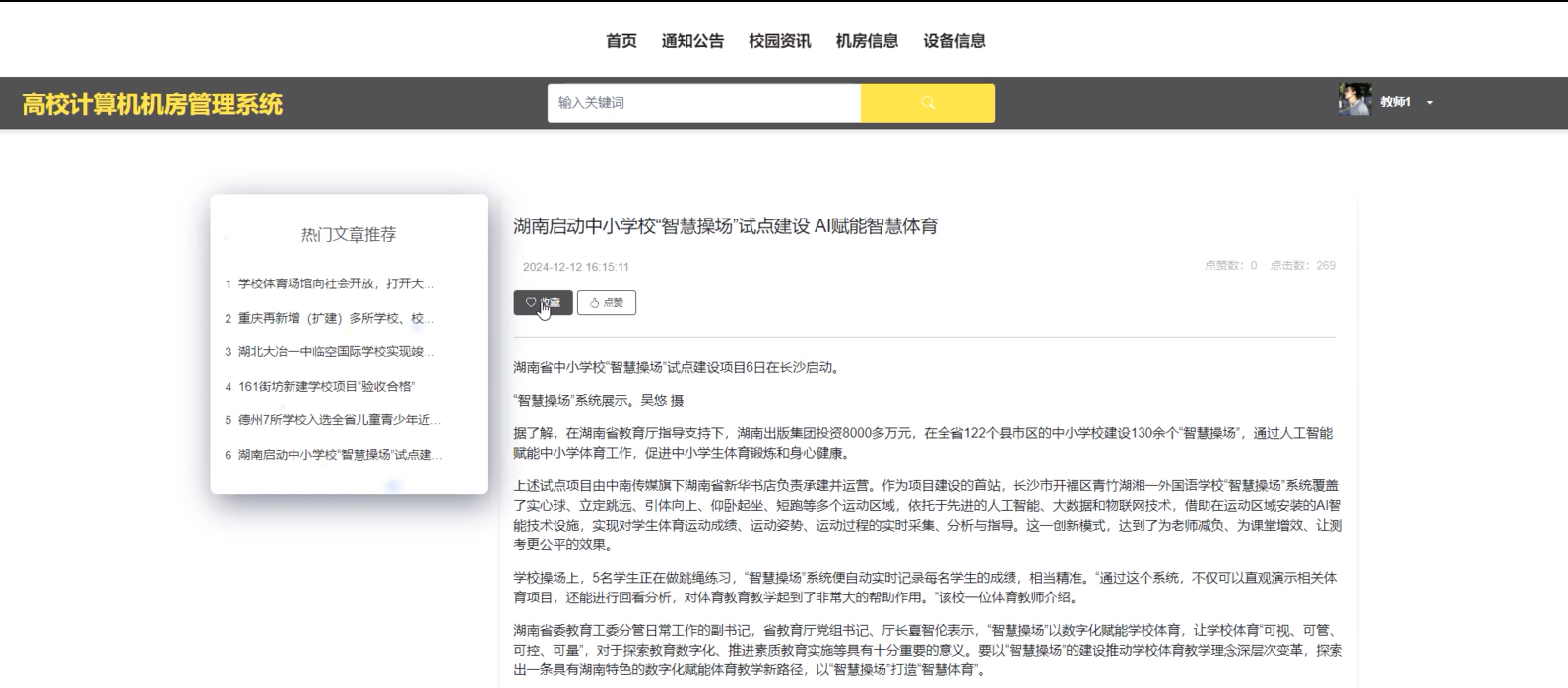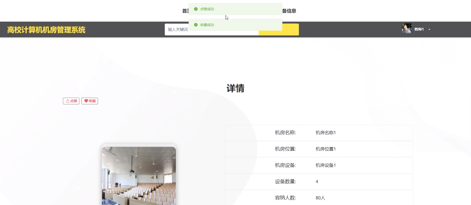 机房信息:在机房信息模块,教师可以查看机房的详细信息,包括机房位置、可用设备、预约状态等。教师可以对机房进行评论、点赞、收藏和预约操作,方便安排教学活动。