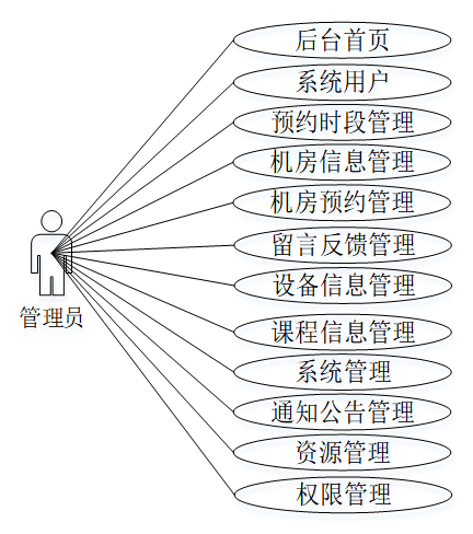 管理员具备后台首页、系统用户、预约时段管理、机房信息管理、机房预约管理、留言反馈管理、设备信息管理、课程信息管理、系统管理、通知公告管理、资源管理、权限管理等需求用例。详细用例图如图3-2所示。