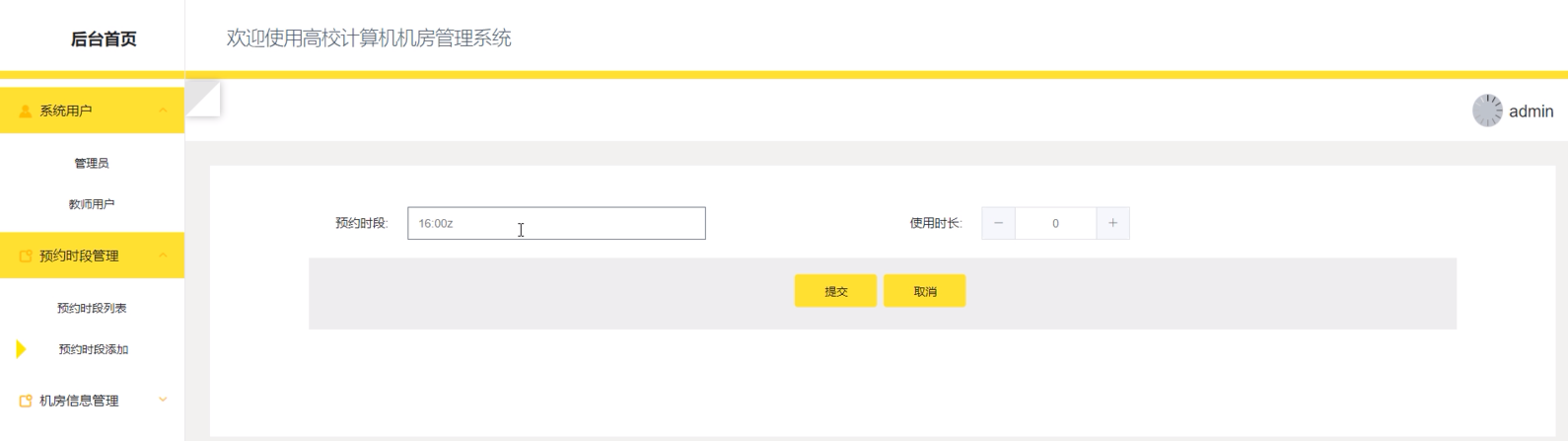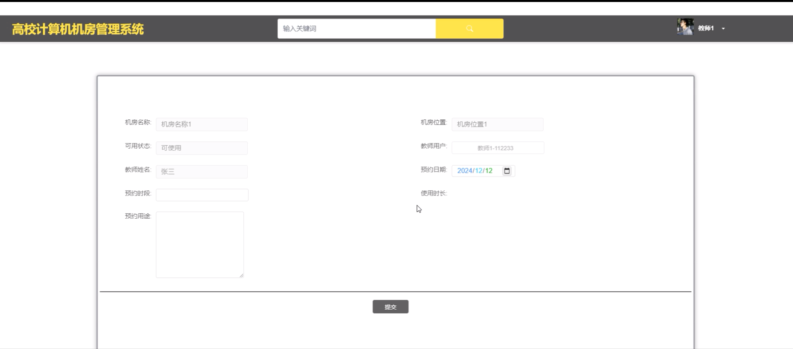 - 机房预约:允许教师查看和管理自己的机房预约情况,包括创建新的预约和取消已有的预约。
