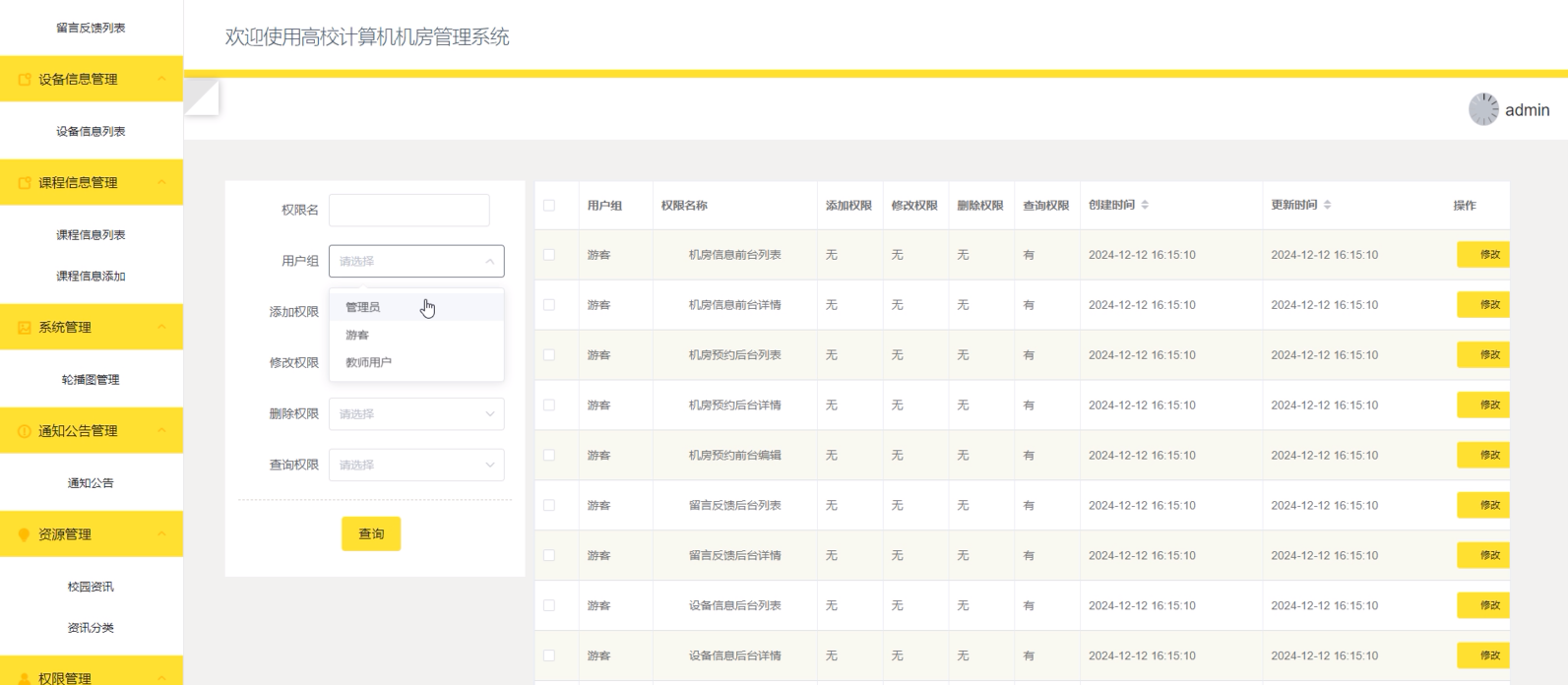 管理员可以对不同用户进行权限分配,确保每个用户根据其角色和职责获得相应的系统访问权限。这有助于保护系统安全,防止未授权访问和操作。权限管理界面如下图5-21所示。