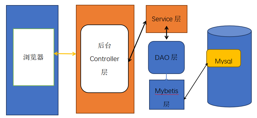 具体交互流程为:浏览器中执行具体操作,操作命令将生成一个do方法。该方法使得浏览器能够访问后台中的Controller层,Controller层由于业务上的需要执行进而访问Service层。Service层收到指令后将会去调用内部DAO层的接口。接口将会和MyBatis层下的一个SQL语句相对接。对接好之后进而访问MySql数据库。更新底层数据,然后将数据同步回MyBatis层,同步变化后的数据将通过DAO层接口,Service层和后台Controller层,直观反映到浏览器页面上。