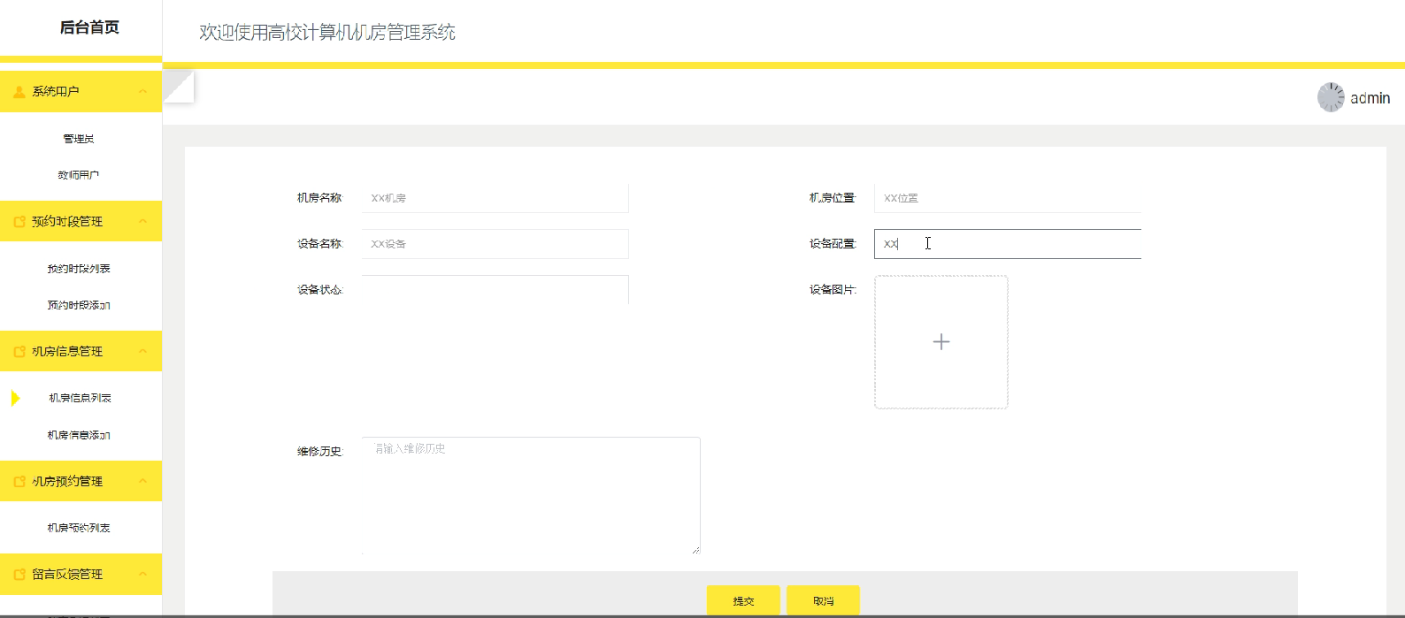 管理员点击“机房信息管理”这一菜单会显示机房信息列表和机房信息添加两个子菜单,点击“机房信息列表”可以查看机房信息详情和用户评论,可以进行查询、重置、删除等操作。点击“机房信息添加”,管理员可以添加新的机房信息,包括名机房名称、机房设备、容纳人数、封面图片、机房简介等。点击右边“设备录入”后输入设备配置、设备状态、维修历史等信息即可完成设备信息的录入;机房信息列表界面如下图5-15所示。机房信息添加界面如下图5-16所示。录入设备信息界面如下图5-17所示。