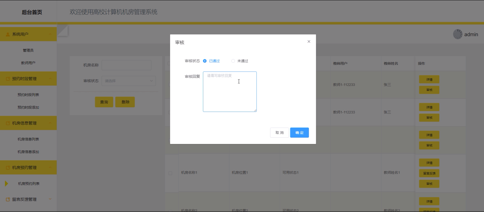 管理员点击系统左侧导航栏上“机房预约管理”菜单,可以查看和管理教师用户的预约情况,并对预约信息进行审核回复,确保机房资源的合理分配。机房预约管理界面如下图5-18所示。机房预约审核如下图5-19所示。