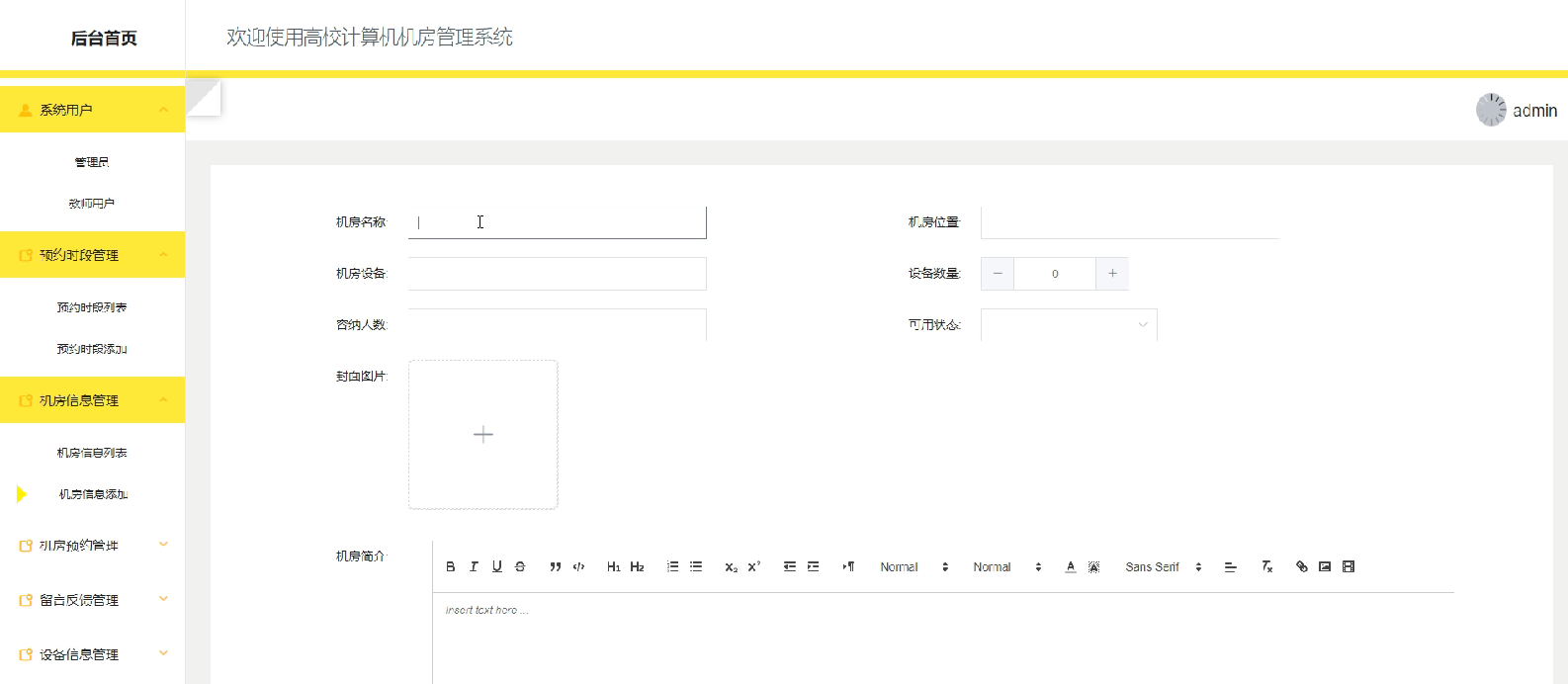 The system achieves automated management of data center resources through information technology, including functions such as data center reservation, equipment monitoring, and fault reporting. The system is developed using SpringBoot technology, which has the characteristics of rapid development, high scalability, and easy maintenance, and can meet the diverse needs of university computer room management. The system provides a user-friendly interface, where teachers can easily make room reservations and inquiries, while administrators can view the real-time usage and equipment status of the room, allocate resources, and handle faults. At the same time, the system also supports data statistics and analysis, providing decision support for managers, helping optimize resource allocation, and improving the overall efficiency of the data center.