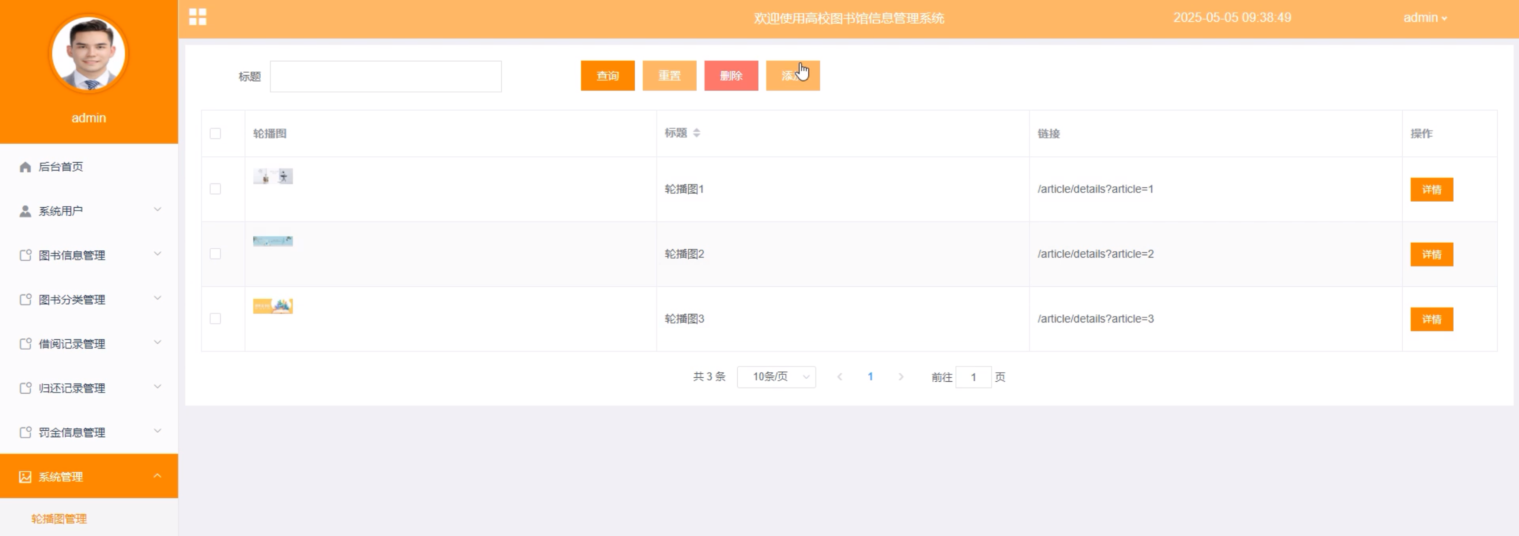 (8)系统管理:管理员点击可查看轮播图管理;如需添加新的轮播图,点击右侧“添加”按钮,上传图片,输入标题和链接,点击“确认”按钮进行添加,可对轮播图进行增删改查。