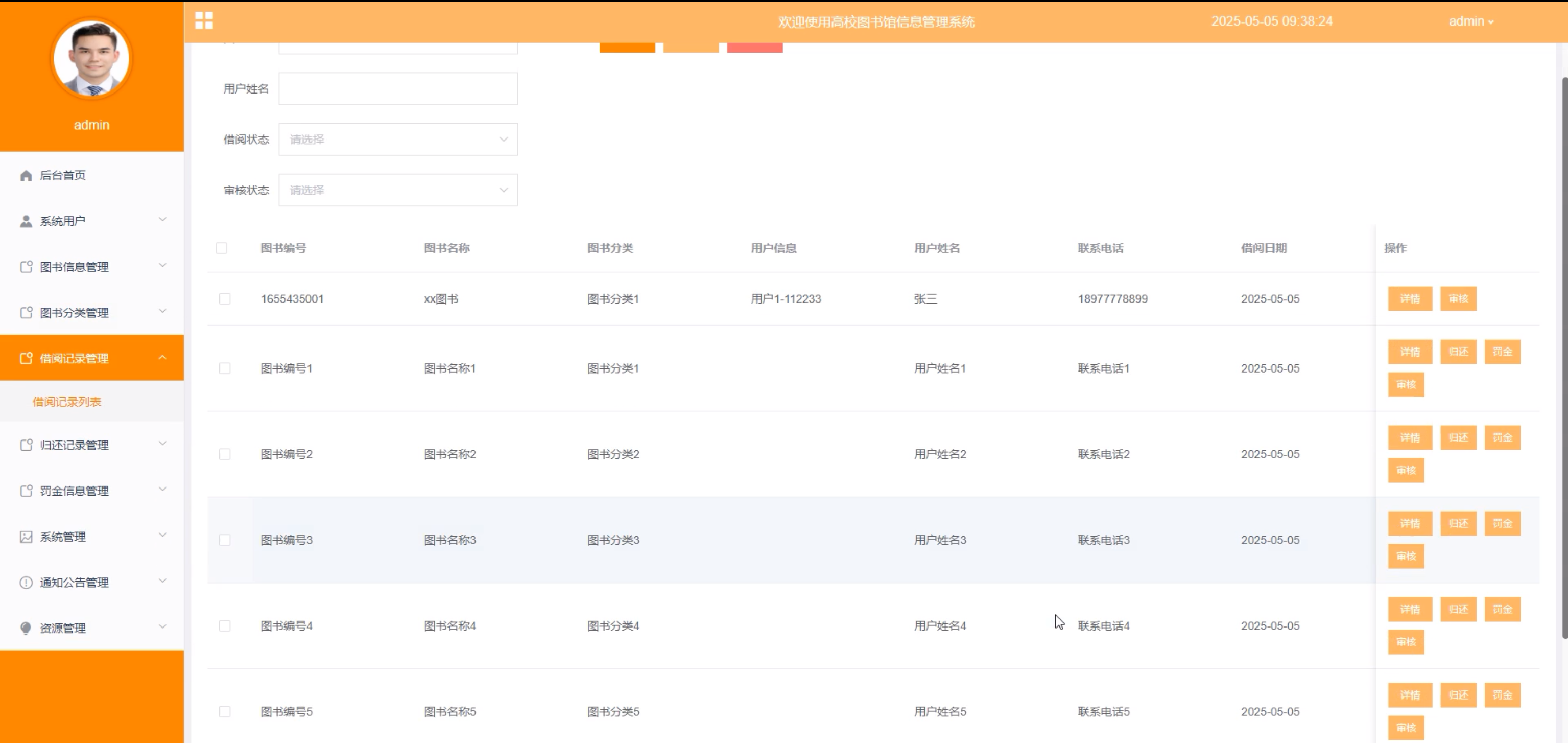 (5)借阅记录管理:管理员点击可查看借阅记录列表,可查看用户借阅详情,可进行审核借阅信息,可查看用户归还信息以及添加罚金信息,进行高效的管理图书借阅。