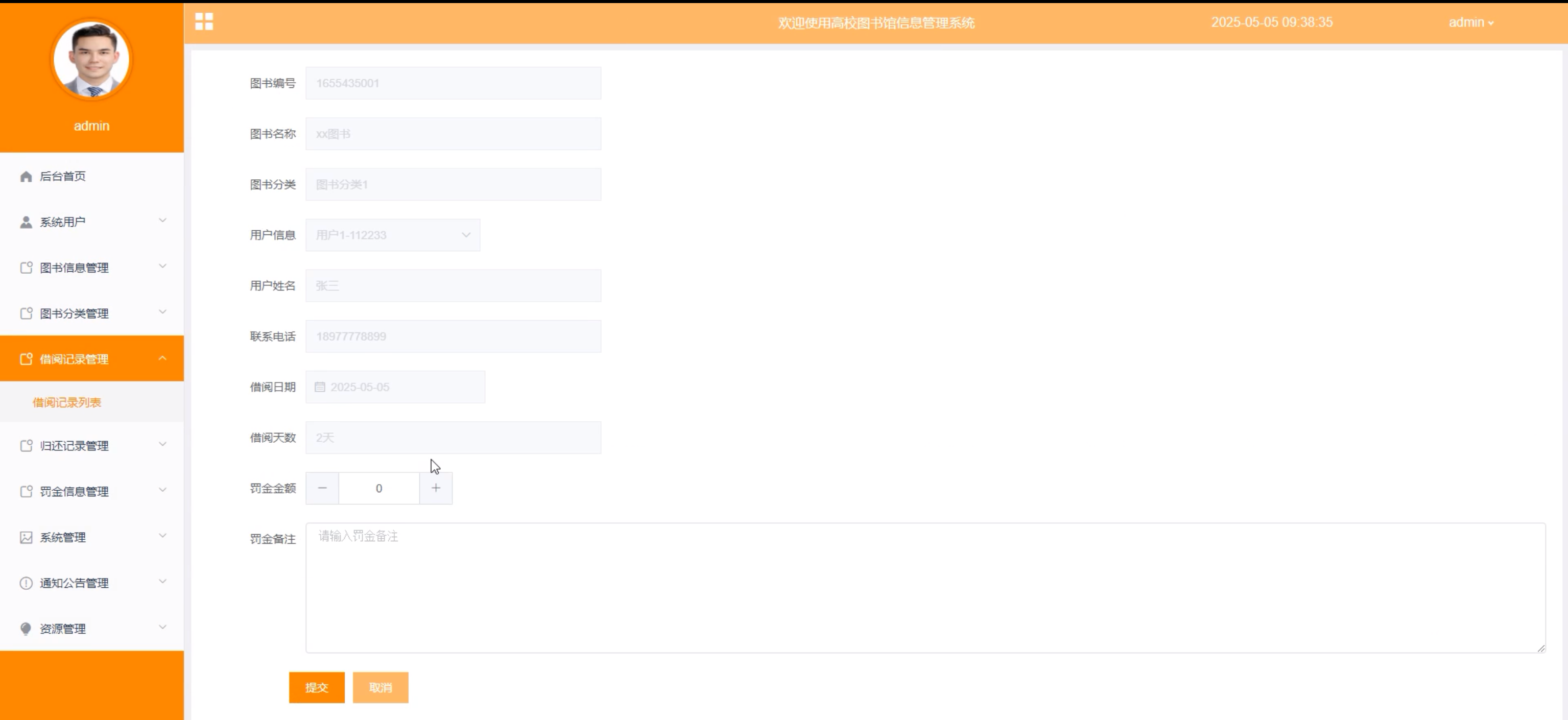借阅记录管理:管理员点击可查看借阅记录列表,可查看用户借阅详情,可进行审核借阅信息,可查看用户归还信息以及添加罚金信息,进行高效的管理图书借阅。界面图如下。