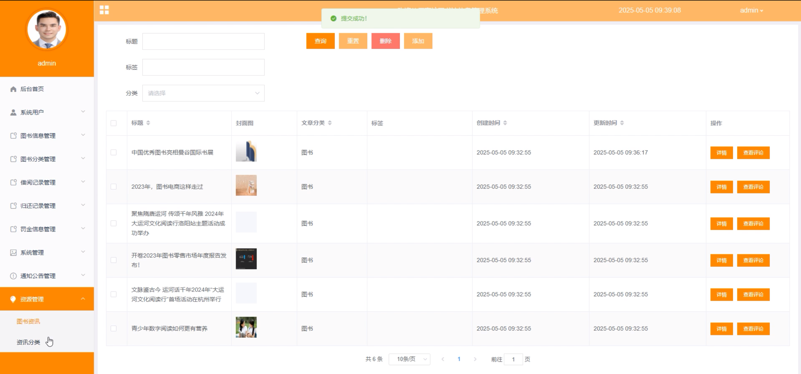 资源管理:管理员点击可查看图书资讯和资讯分类;如需添加新的资讯,点击“添加”按钮,上传封面图,输入标题,选择分类,输入标签、描述和正文,点击“确认”按钮进行添加。同时可对资讯和分类进行增删改查。界面图如下。