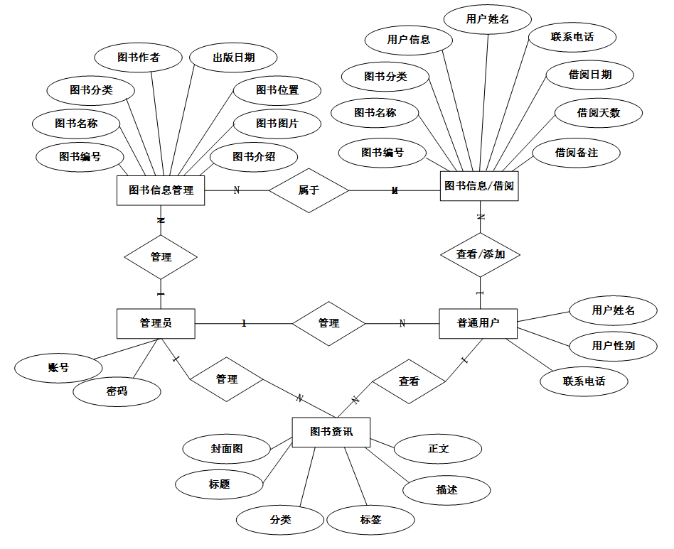 本文在系统分析阶段就抽取了一些实体,根据实体之间的关系,经过分析进行系统E-R图的设计。高校图书馆信息管理系统总体E-R图如下图所示。