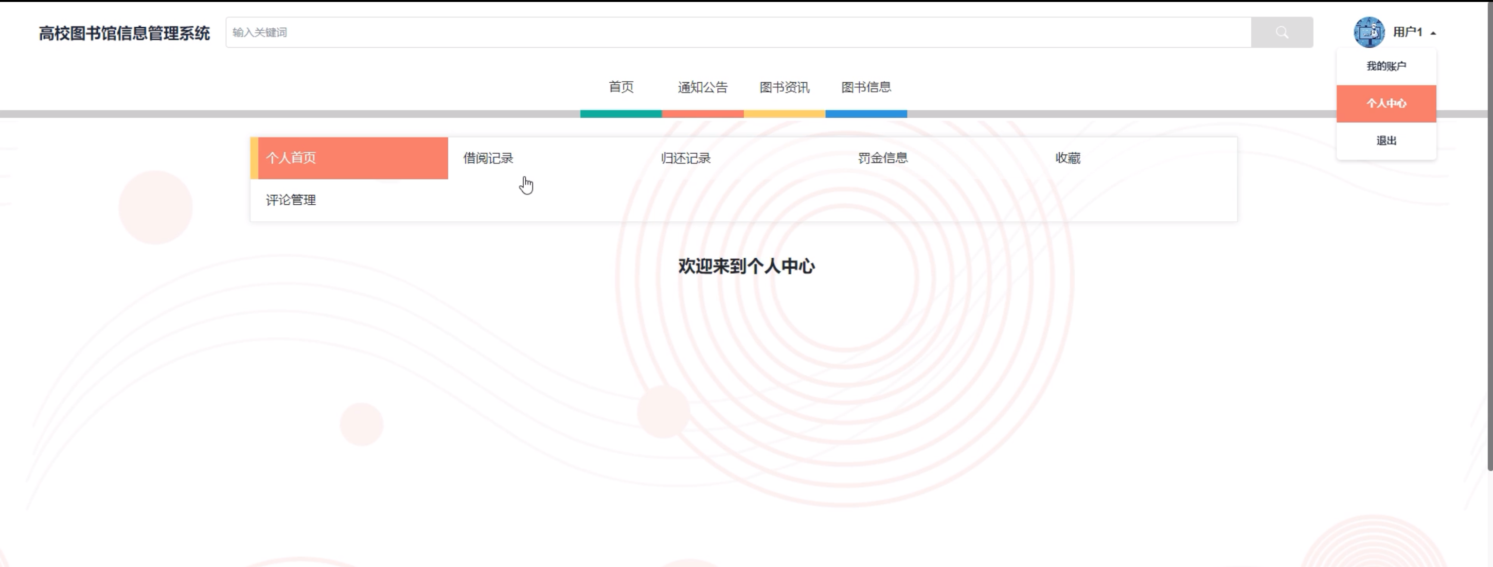 (7)个人中心:个人中心包含多个功能模块,包括个人首页、借阅记录、归还记录、罚金信息、收藏和评论管理。用户可在个人首页查看借阅信息、添加图书归还信息、支付逾期归还罚金,同时可查看和管理收藏信息和评论信息。