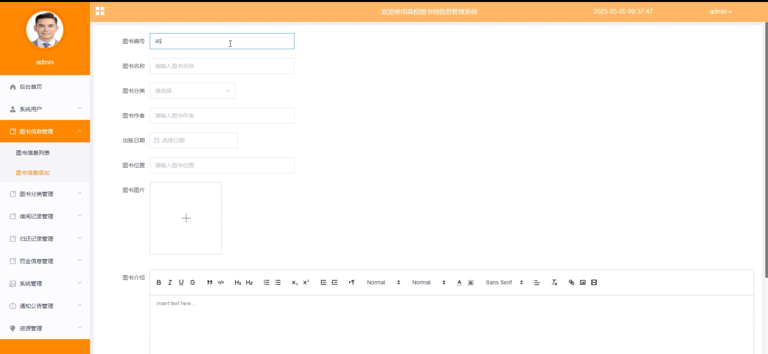 (3)图书信息管理:管理员点击可查看图书信息列表和图书信息添加;点击“图书信息添加”可填写相关信息,包括图书编号、图书名称、图书分类、图书作者、出版日期、图书位置、图书图片和图书介绍。