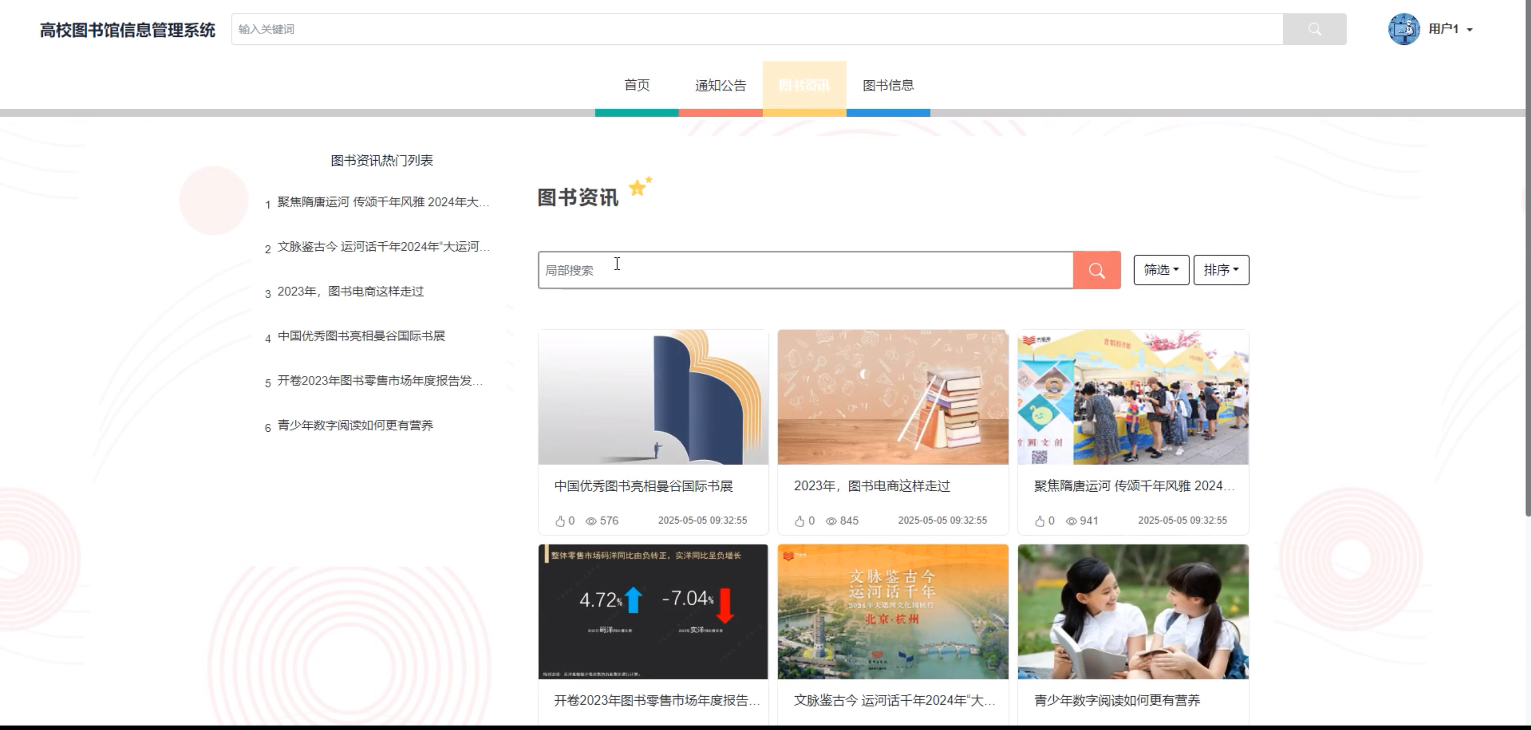 (4)图书资讯:图书资讯功能模块提供最新的图书相关文章和信息,用户可以通过搜索、筛选和排序功能快速找到所需内容,同时可对资讯文章进行点赞、收藏和评论。