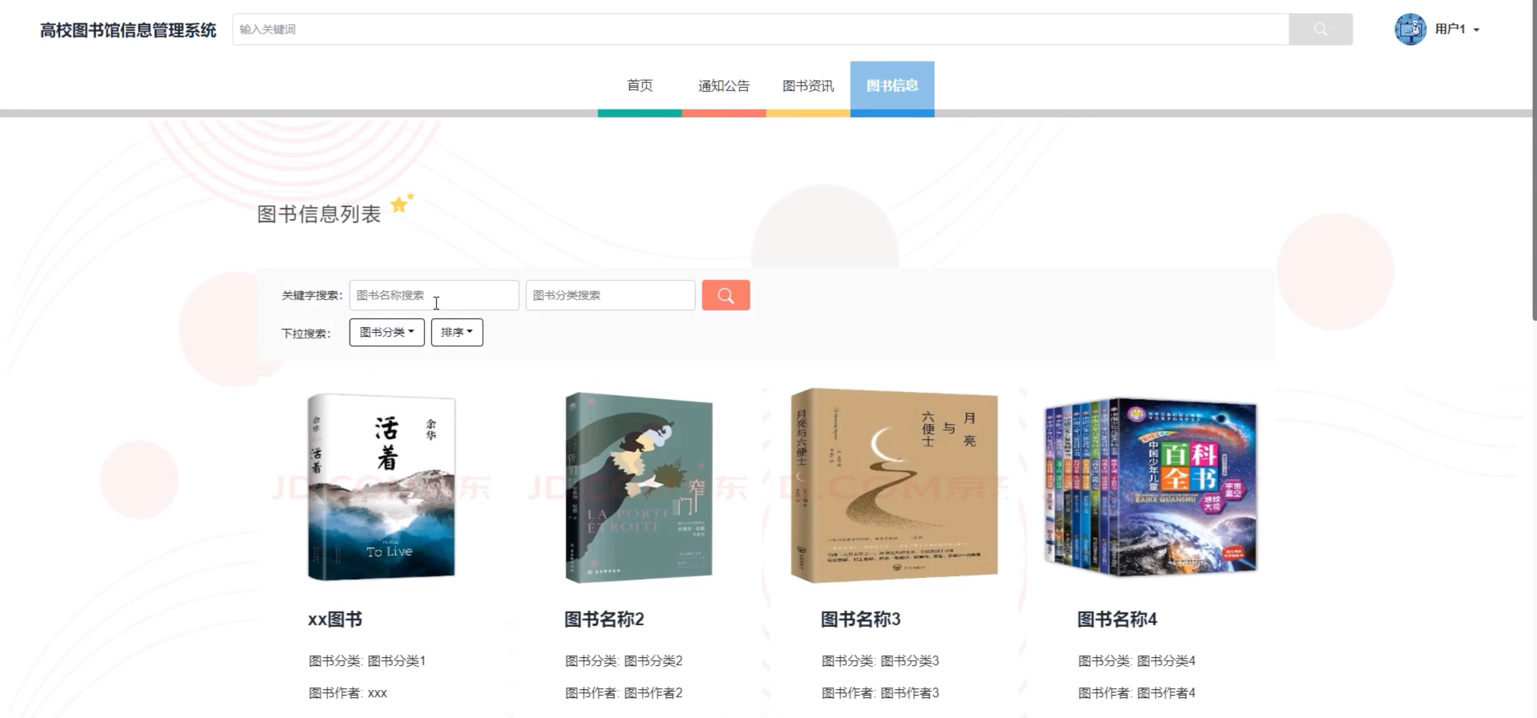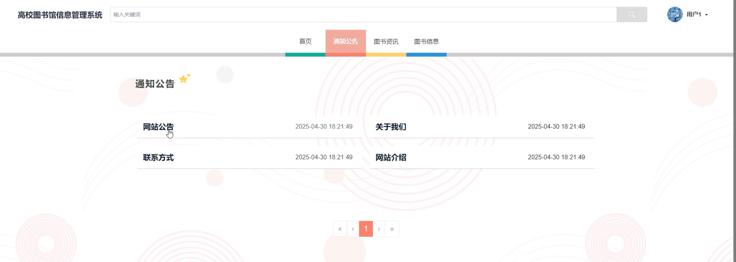 (2)首页:首页展示轮播图、通知公告、图书资讯、图书信息等功能导航栏。