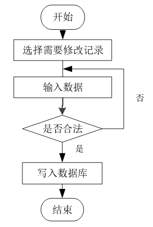 用户首先选择需要修改的记录,输入修改后的数据,系统判断输入数据是否合法。若数据不合法,提示重新输入;若数据合法,则将修改后的数据写入数据库,完成操作后流程结束。修改信息流程图如图3-6所示。