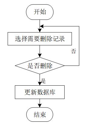 用户选择需要删除的记录后,系统判断是否确认删除。若未确认,返回选择环节;若确认删除,则更新数据库,删除对应记录,完成操作后流程结束。删除信息流程图如图3-7所示。