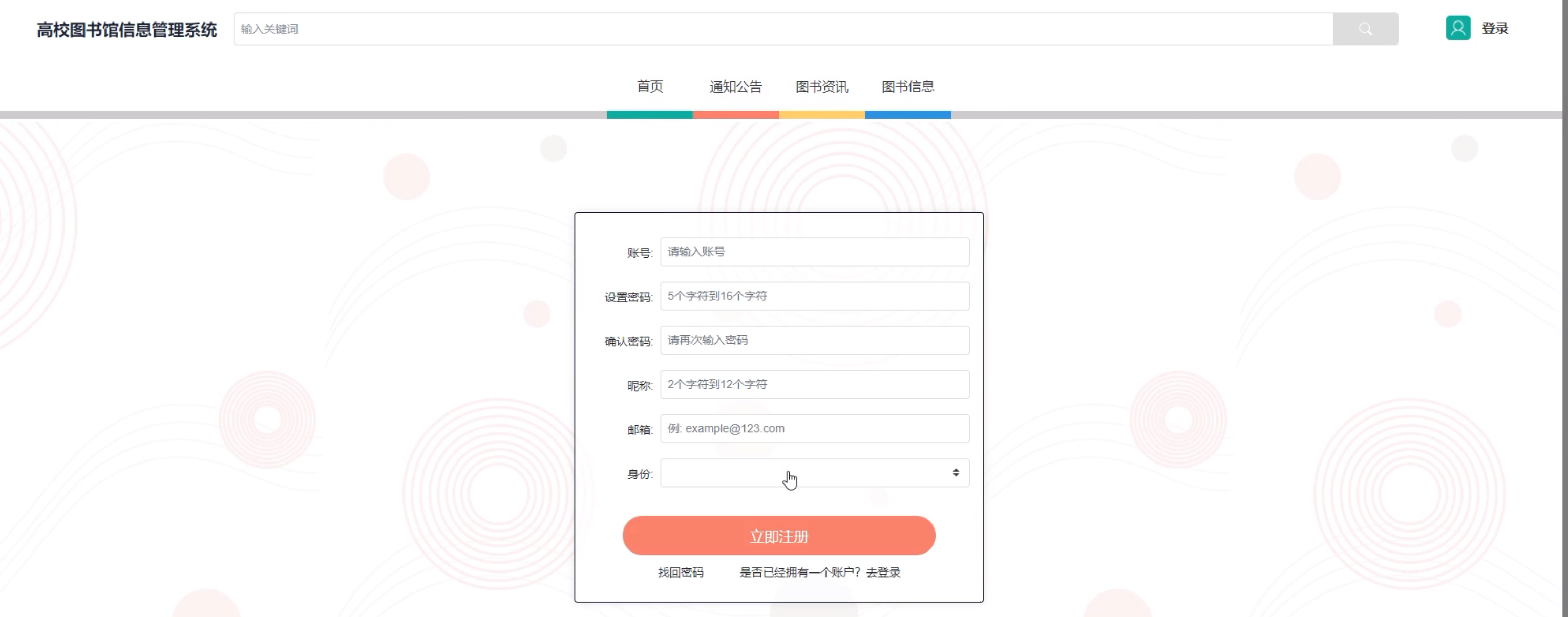 (1)注册登录:在高校图书馆信息管理系统中,用户可通过简洁的界面完成注册与登录操作。注册时,用户填写基本信息并提交即可创建账户;登录时,输入用户名和密码后即可快速进入平台