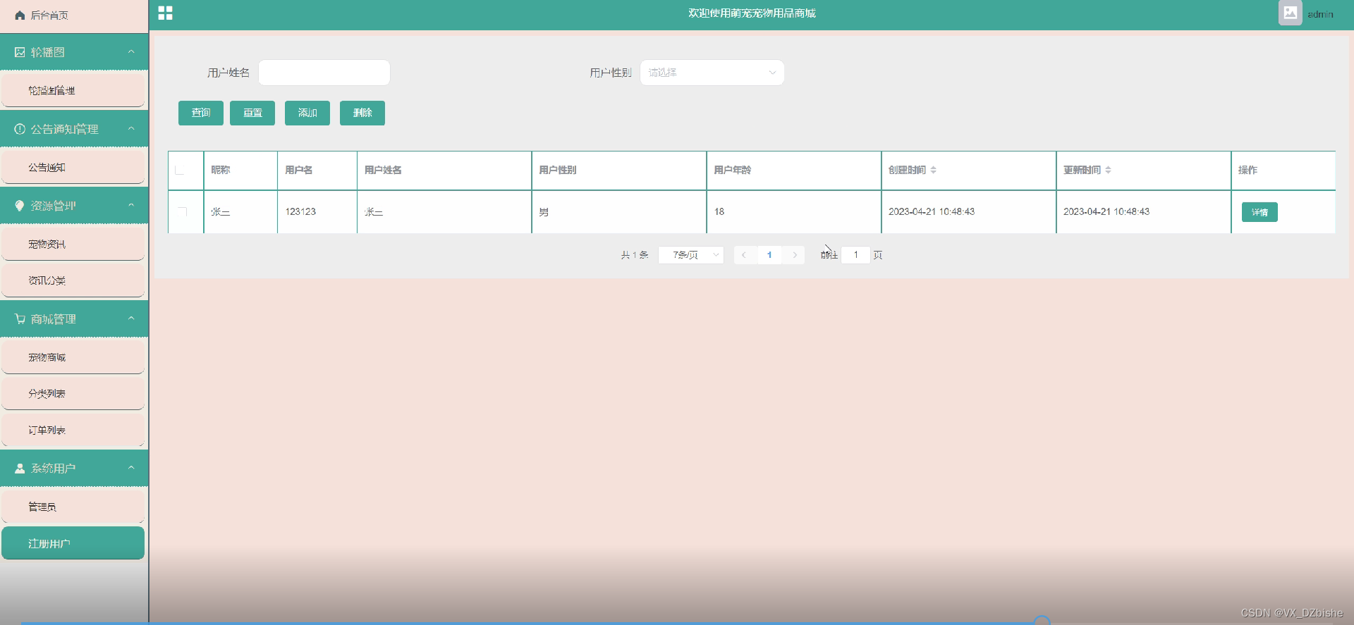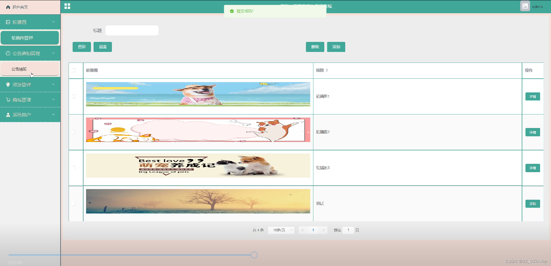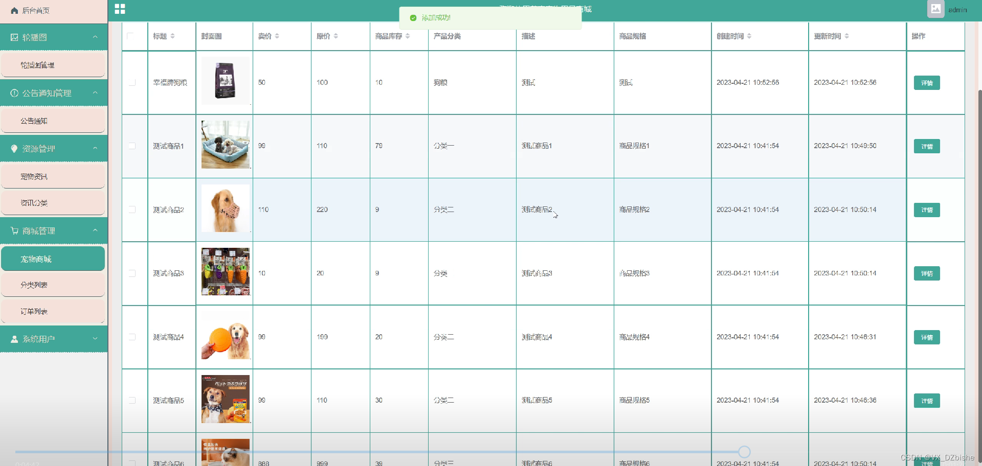 宠物商城管理,在展示页面对宠物商城的商品进行添加,还可对商品进行编辑删除详细等操作 图5-10所示
