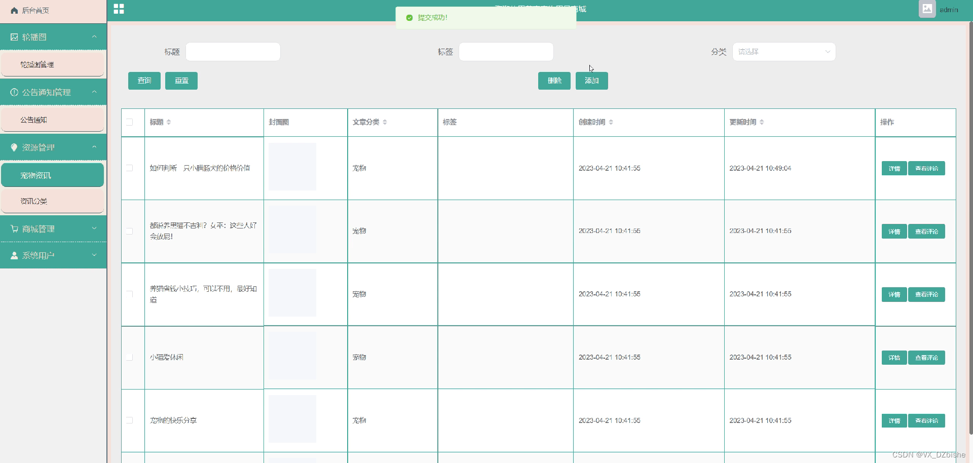 公告通知管理,在公告通知管理页面可以对公告信息进行增删改查等,如图5-6所示。还可以根据需要对宠物资讯进行管理操作,如图5-7所示。