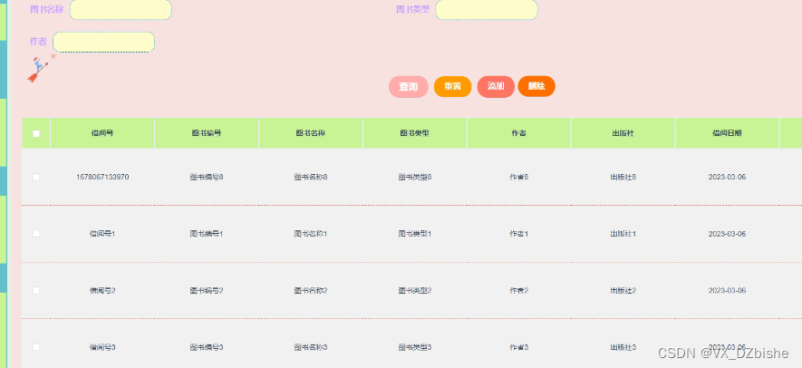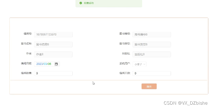 管理员发布图书后,图书在系统前台显示,用户浏览图书信息,包括图书编号、图书名称、图书类别、作者、图书封面,选择相应的图书借阅,通过id传参,找到该图书,在图书借阅添加页提交借阅表单,生成借阅记录。