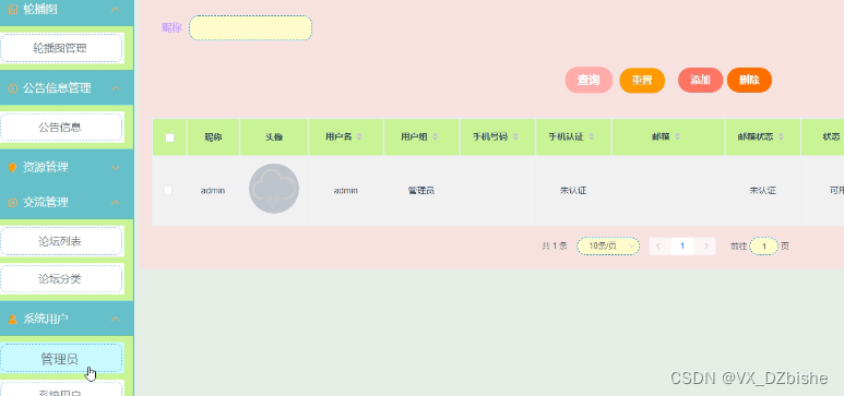 管理员对系统用户的管理,在列表实现管理员用户的管理,包括录入、删除、修改,修改密码通过SESSION获取用户名,然后输入新密码,提交,使用sql命令更新密码。
