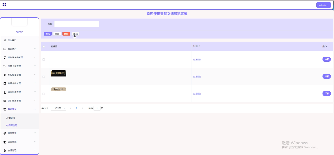 管理员点击“系统管理”这一菜单会显示轮播图菜单,管理员可以对前台展示的轮播图进行设置,轮播图界面如下图4-9所示。