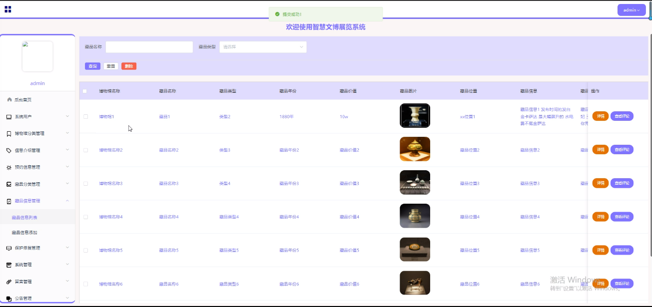(5)藏品信息:进入后台首页工具栏点击“藏品信息”这个按钮可以查看所有藏品信息等信息,可以进行详情查看、删除、查看评论等操作。