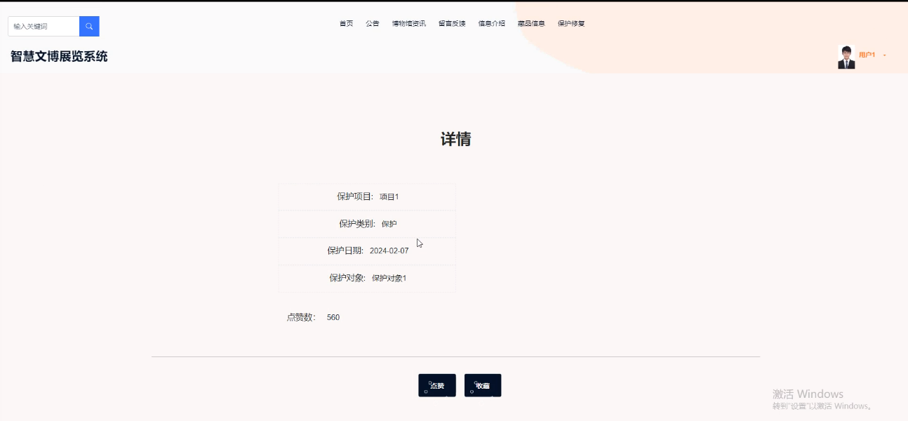 (2)保护修复:当用户点击“保护修复”这一菜单按钮,会显示管理员在后台发布的所有的保护修复信息,可以查看详情;可以进行收藏、点赞等;