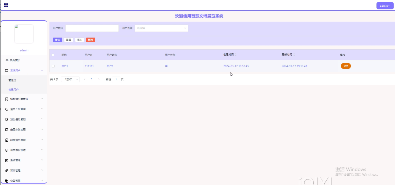 智慧文博展览系统中的管理人员是可以对注册的用户进行管理的,也可以对管理员进行管控。界面如下图4-6所示。