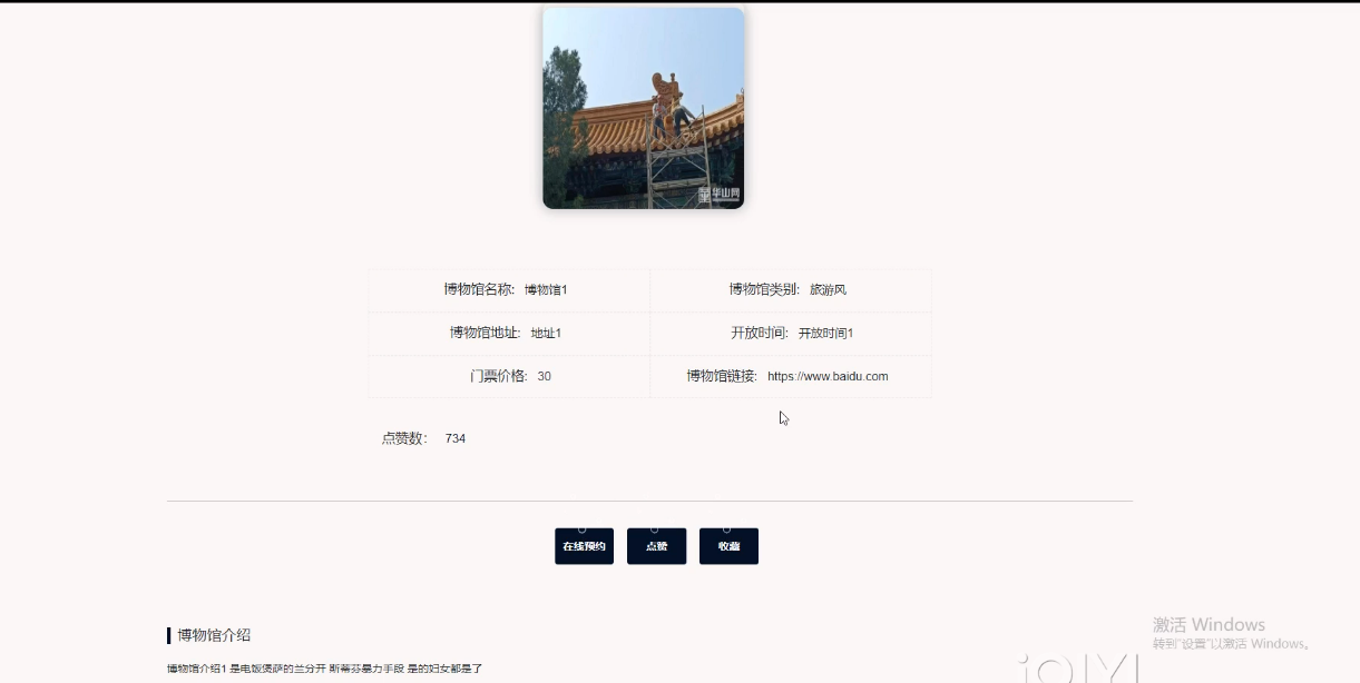 (5)信息介绍:当用户点击“信息介绍”这一菜单按钮,会显示管理员在后台发布的所有的信息介绍信息,可以查看详情;可以进行在线预约、收藏、点赞、评论等;