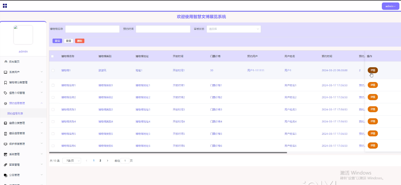 管理员点击“预约信息管理”,可以对预约信息进行增删改查的操作,界面如下图4-7所示。