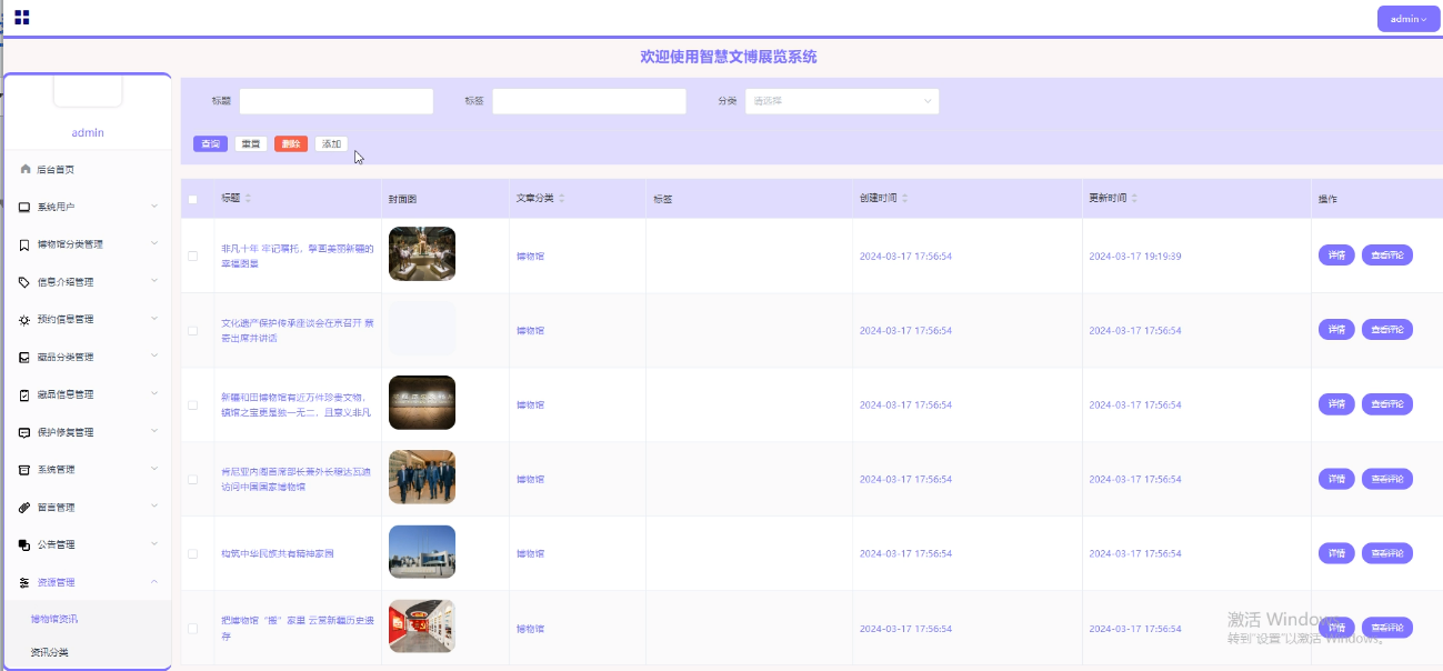 (4)资源管理:进入后台首页工具栏点击“资源管理”这个按钮可以查看所有博物馆资讯、资讯分类等信息,可以进行详情查看、删除、查看评论等操作。