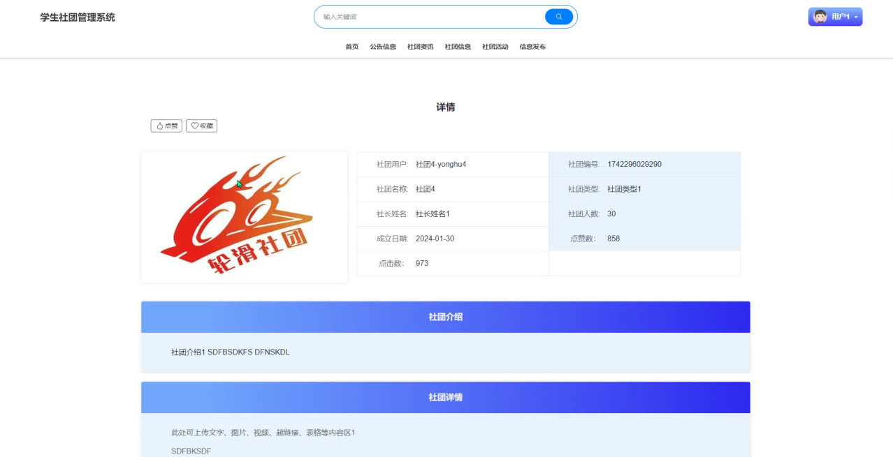 社团信息模块允许用户详细查看所有注册社团的基本介绍、历史成就及成员构成等信息。每条社团信息都附有“加入申请”按钮,简化了学生寻找和加入心仪社团的过程。社团信息详情展示页面如图5-6所示。