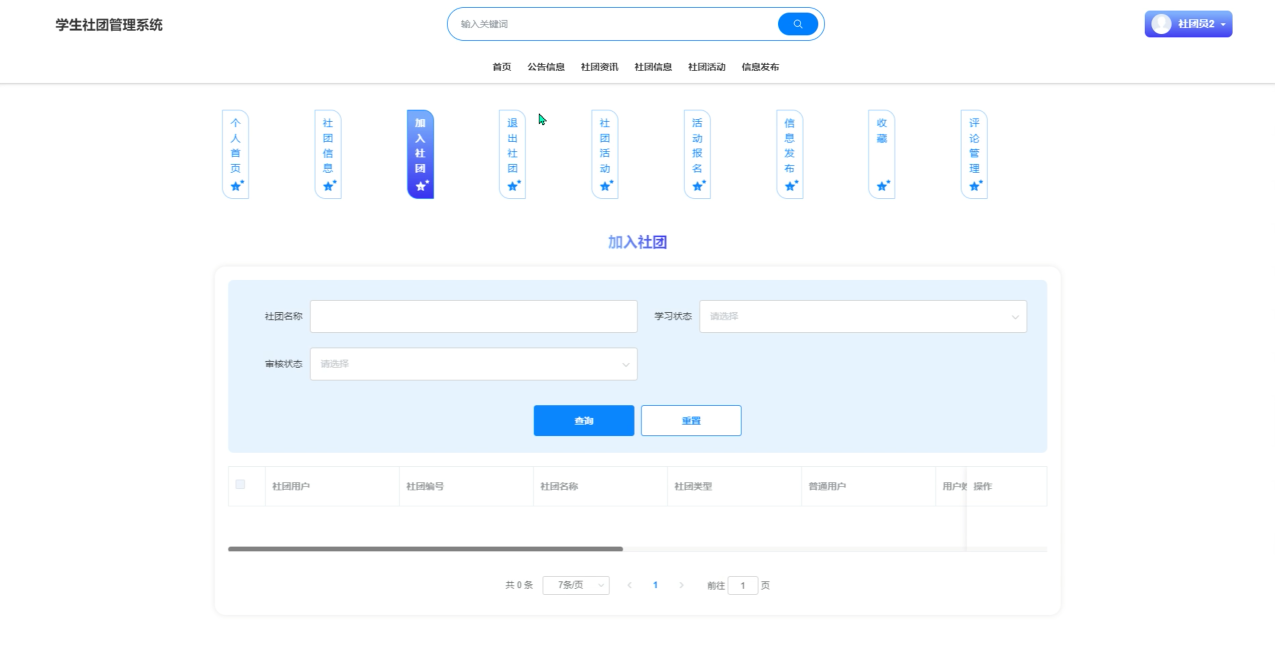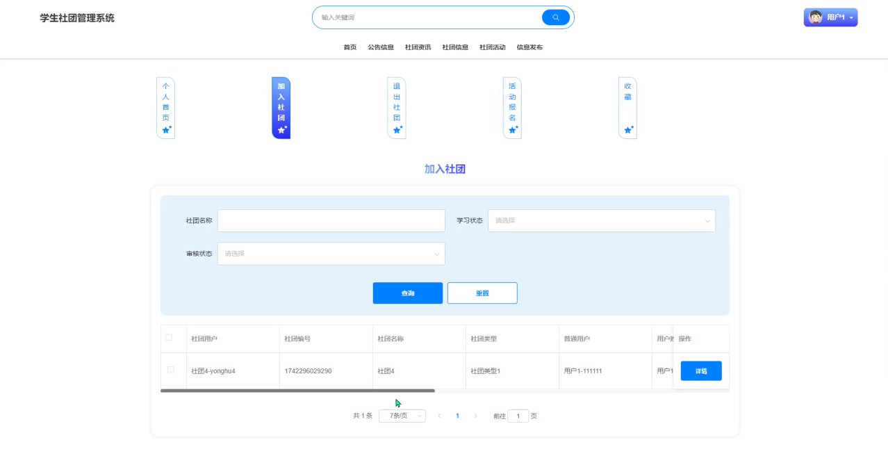社团信息:浏览所有社团的基本介绍,选择感兴趣的社团加入。