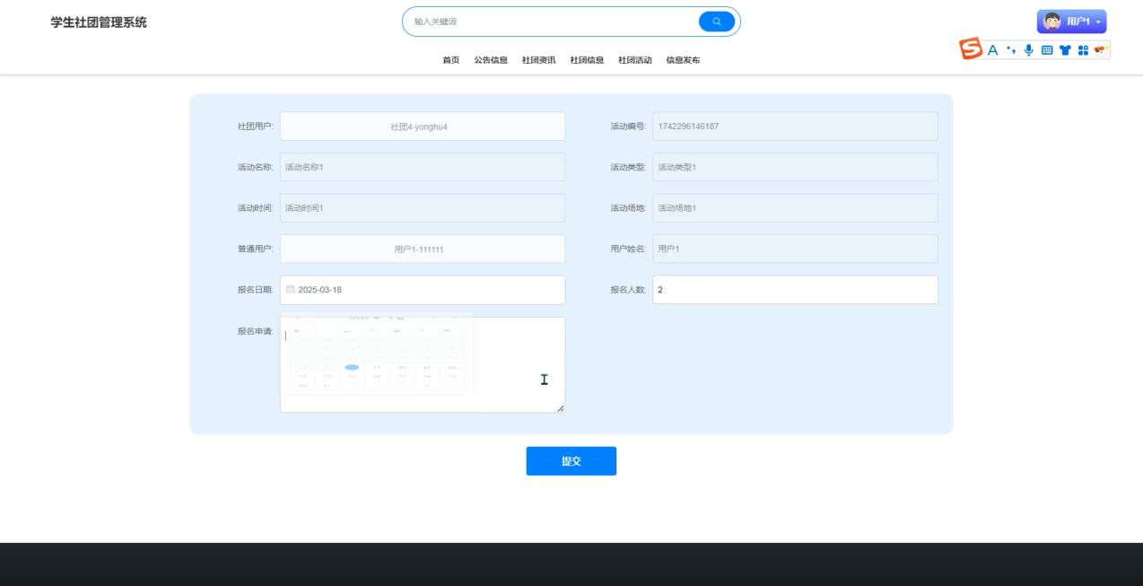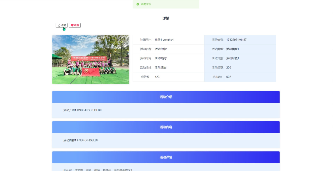 The system realizes multi-role functional modules including ordinary users, community users and administrators. Specifically, ordinary users can browse club information and sign up for club activities; Community users can publish community activities, manage community information and information release, etc.; The administrator is responsible for the maintenance and authority management of the entire system. Technically, it is written in Java language, combined with MySQL database for data storage, and Spring Boot is used to simplify the server-side development process and ensure the stability and scalability of the system.