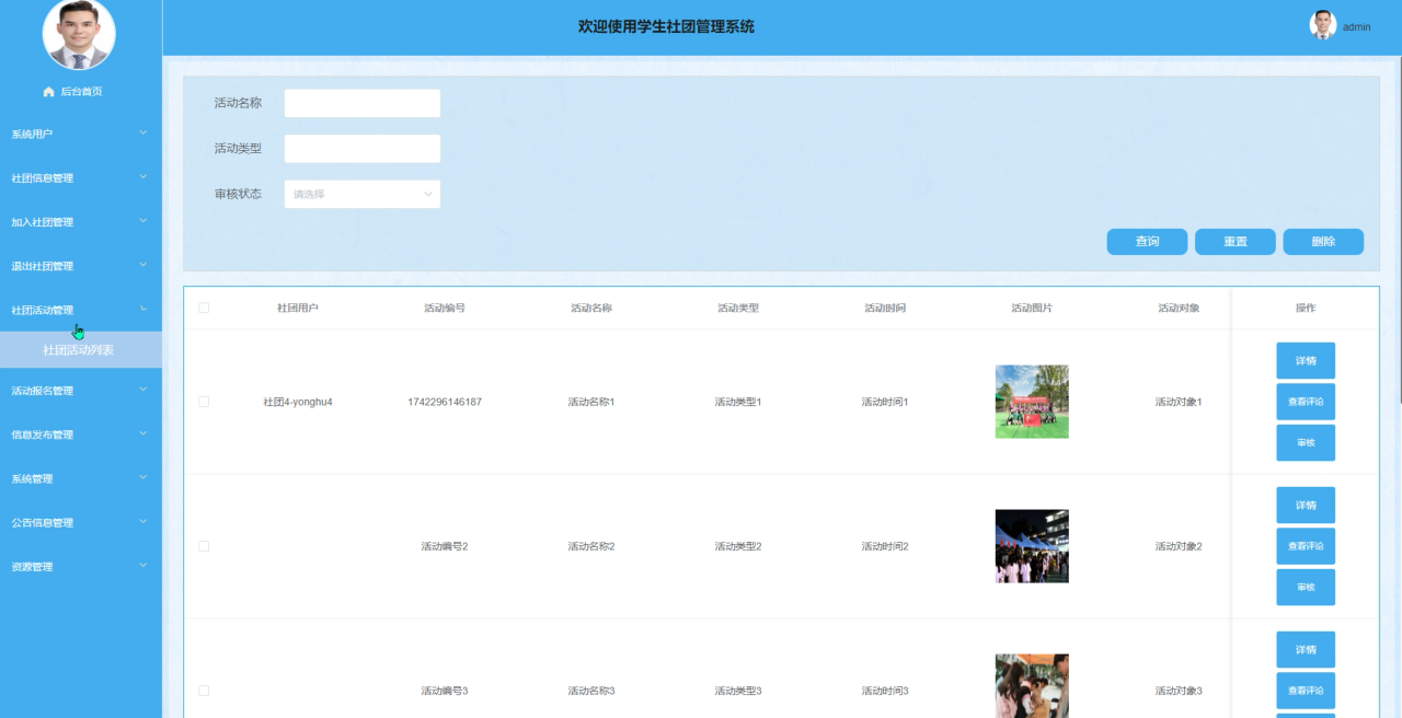 社团活动管理模块设计旨在确保所有社团活动的顺利组织与实施,同时维护校园活动秩序。通过这一模块,管理员能够全面监控和管理社团活动的整个生命周期,包括活动的创建、审核、修改及删除。社团活动审核界面如下所示。