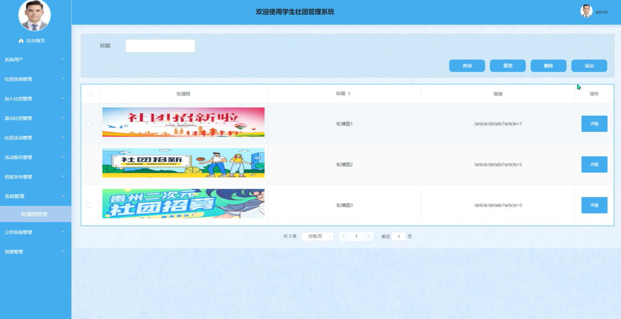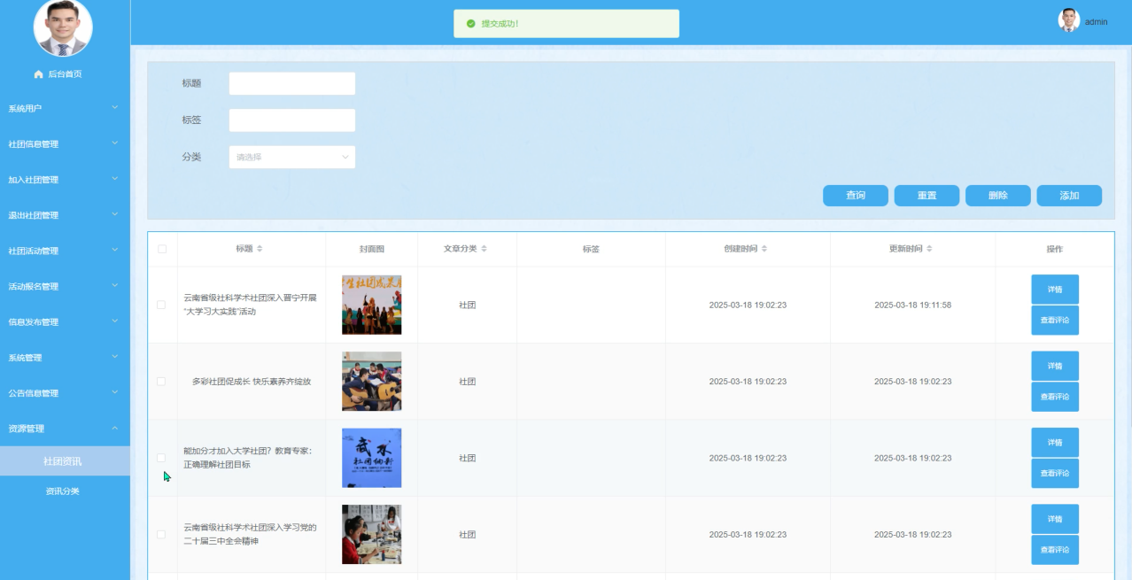 资源管理:管理社团资讯,包括新增、编辑和删除操作,定义和维护社团资讯的分类。