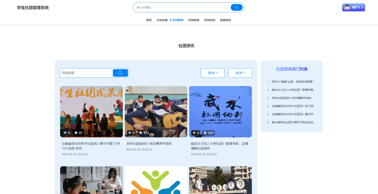社团资讯页面展示了各个社团的最新动态和发展成就,鼓励学生积极参与校园生活。每个社团都有专属的信息板块,包括近期活动预告、获奖情况等,促进社团间的交流与竞争。社团资讯界面如下图5-5所示。