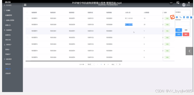 在管理员功能页面可以查看首页、轮播图、疫情公告、资源管理(疫情资讯、资讯分类)系统用户(管理员、普通用户)模块管理(物资信息、采购入库、点验出库)等内容进行相对应操作,如图5-10所示。