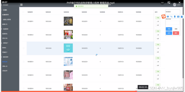物资信息管理,在物资信息管理页面可以查看索引、物资名称、物资封面、物资类型、物资数量、包装形式、物资规格、物资详情等信息,并可根据需要进行修改或删除操作,如图5-12所示。