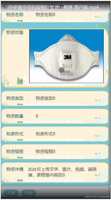 物资信息,在物资信息页面可以填写物资名称、物资封面、物资类型、物资数量、包装形式、物资规格、物资详情等信息,并可根据需要入库或者出库。如图5-5所示。