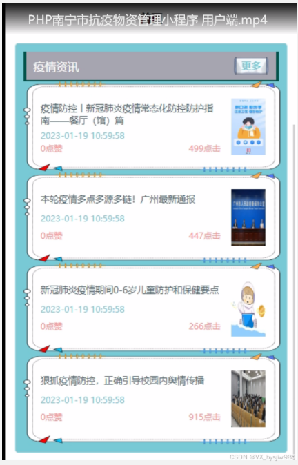 疫情资讯,在疫情资讯页面可以查看标题、资讯内容、封面等信息,并可对资讯进行点赞、收藏等操作。如图5-4所示。