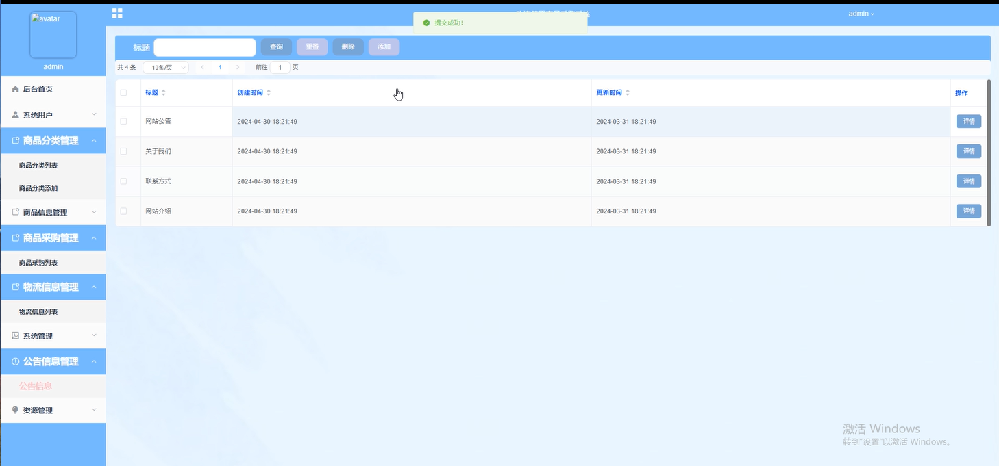 管理员点击“物流配送管理”这个菜单,可以管理商品的物流信息,包括查看订单配送状态、更新物流信息等。公告信息界面如下图所示。