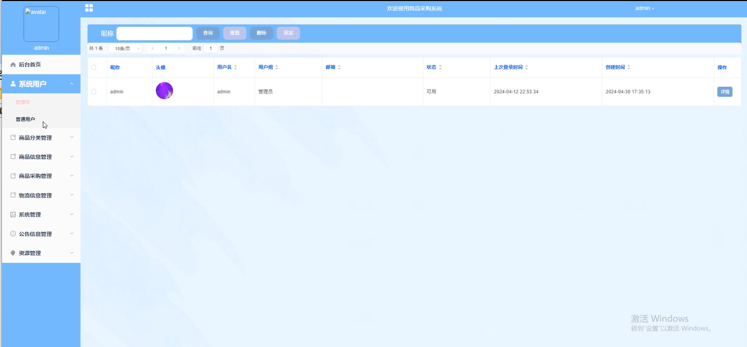 基于Python语言的商品采购系统的中的管理人员是可以对注册的普通用户进行管理的,也可以对管理员进行管控。界面如下图4-7所示。