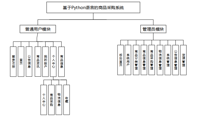 按照基于Python语言的商品采购系统的的角色,系统划分为了普通用户模块和管理员模块这两大部分。