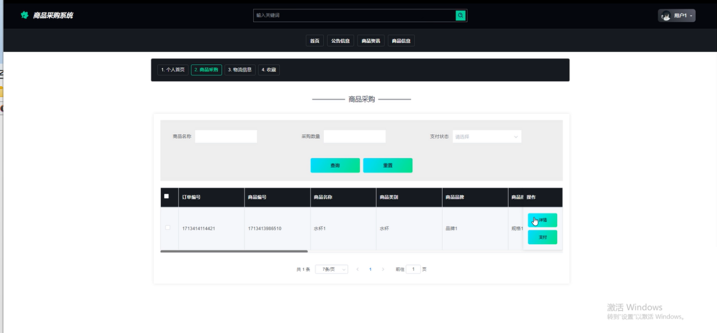 当用户点击个人中心“商品采购”,可以查看自己的商品采购记录,并可进行支付。界面如下图所示。
