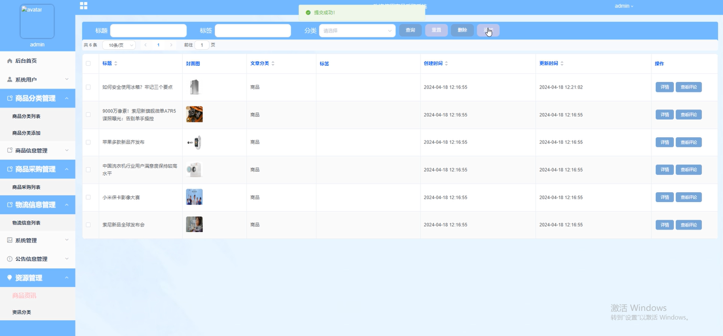 当管理员点击“资源管理”这一菜单的时候可以管理系统发布的商品资讯内容,包括发布、编辑和删除操作,还可以对商品资讯进行分类管理,方便用户浏览和检索。界面如下图所示。