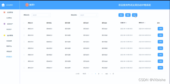 (6)课程信息:教师点击“课程信息”会显示出所有的课程信息,支持通过课程名称或者课程教师对课程信息进行查询,如果想要添加新的课程信息,点击“添加”按钮,输入相关信息,点击“提交”按钮就可以添加了,同时可以选择某一条课程信息,点击“删除”进行删除。
