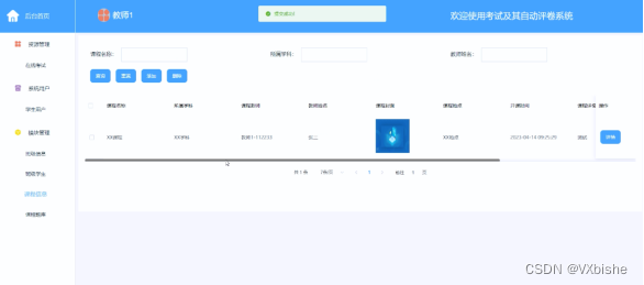 点击“课程题库”这个菜单,可以查看到系统中所有添加的课程题库,支持通过课程名称或者题库类型对课程题库进行查询,如果想要了解某一课程题库的详细信息,点击后面的“详情”会进入详情界面。界面如下图4.7所示。